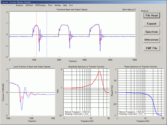 読み込んだ入出力波形から伝達関数を計算し、振幅と位相をグラフ表示します。